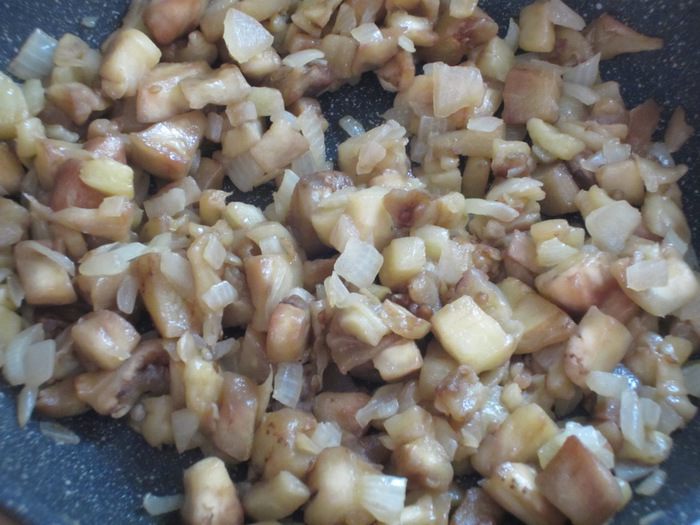 Мякоть баклажана порубить ножом и добавить к луку.Жарить 10 -15 минут до мягкости баклажанов.