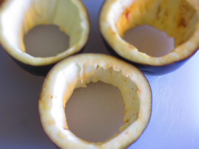 Баклажан разрезать на 3 части. Получатся 3 цилиндра. Острым ножом вырезать мякоть, отступая на 0.5 см от бортика.