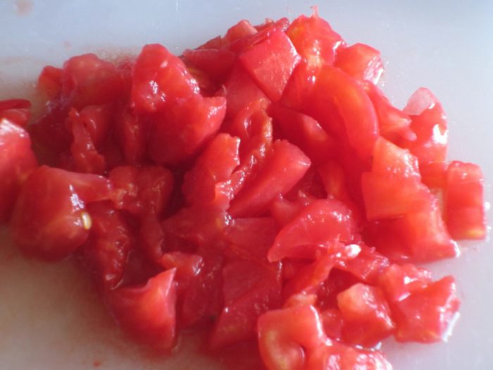 Помидор надрезать крест-накрест и ошпарить кипятком. Снять кожицу и мелко нарезать мякоть.