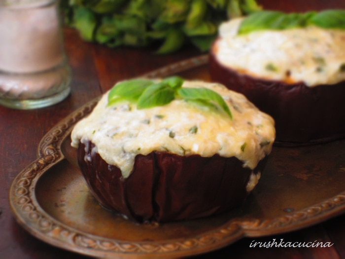 Наполнить баклажаны начинкой,поставить на противень с пергаментом и запекать в разогретой до 180 ° С духовке 30 минут.