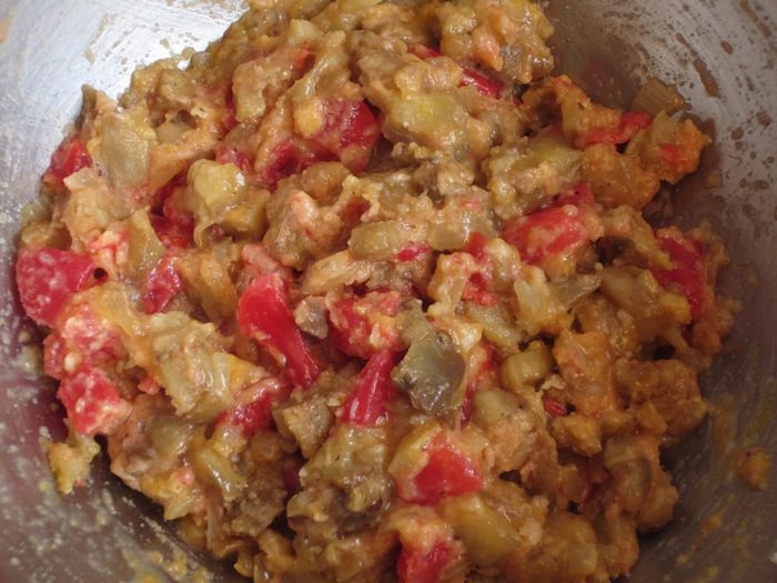 В миску выложить мякоть баклажанов,добавить лук,помидоры,яйцо,пармезан,панировочные сухари,соль,перец и хорошо перемешать.