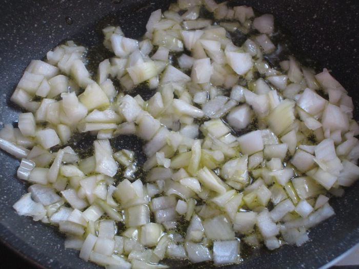 Лук мелко порезать. На сковороде разогреть оливковое масло и пассеровать лук несколько минут.