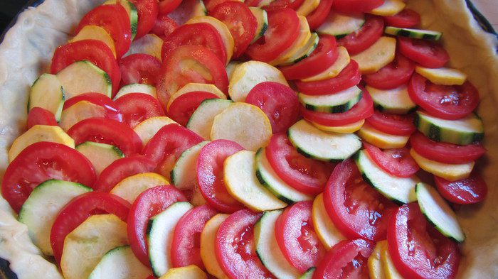 Выкладываем поочередно кружочки цукини и помидоров так, чтобы они были слегка внахлест.