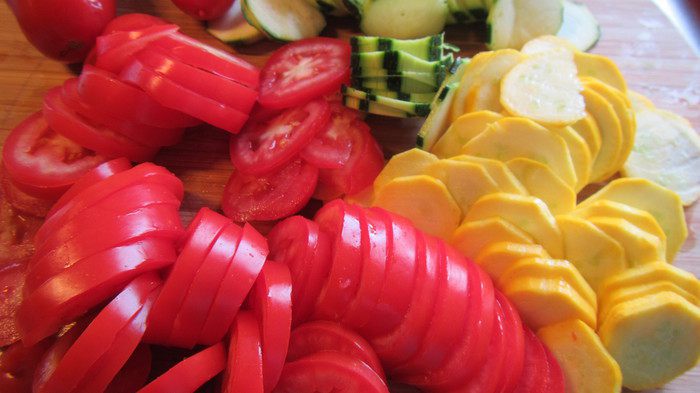 Нарезаем цукини и помидоры тонкими кружочками.