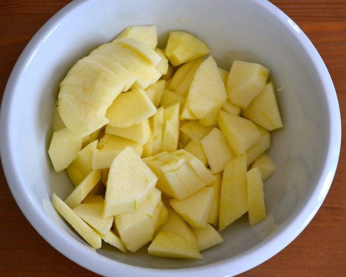 Яблоки вымыть, очистить от кожуры и нарезать мелкими кубиками.