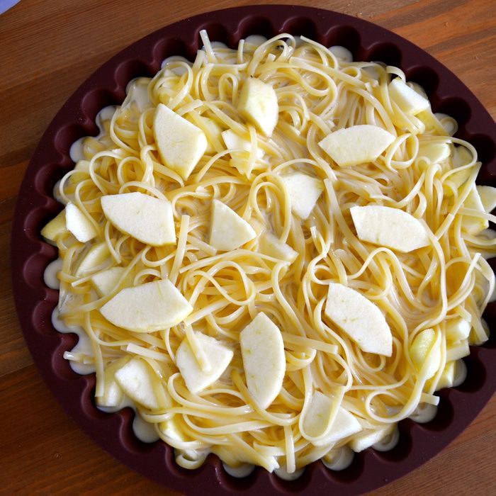 Форму смазать маслом, выложить в нее яблочно-макаронную смесь и залить молоком с яйцами.