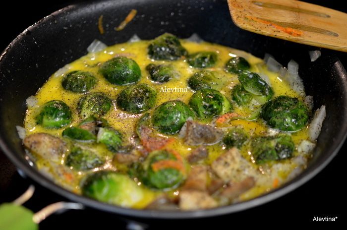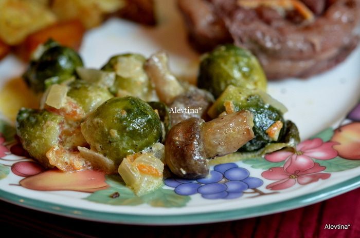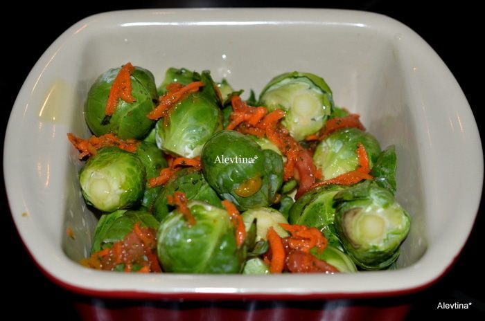 Разогреть духовку до 200 гр. выложить на противень или в жаропрочное блюдо очищенную капусту, сбрызнуть оливковым масло и посолить. Поставить в духовку на 25 мин. Я не солю блюда солью, использую свою зимнюю овощную заправку из моркови и томатов на соли.