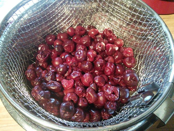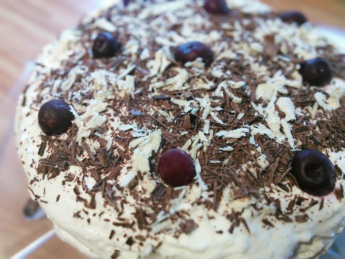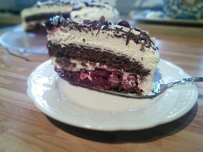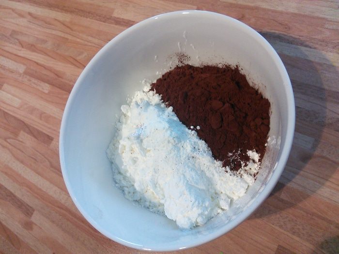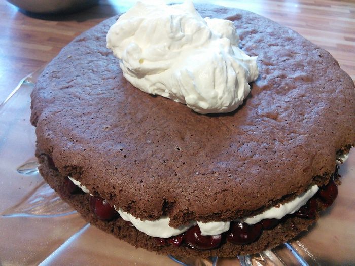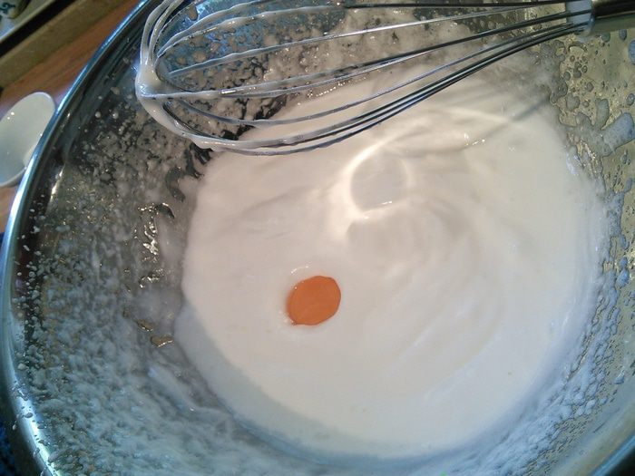 Белки отделить от желтков. Белки взбить, постепенно добавляя 3 ст.л. воды до средней пены, затем добавляя сахар, взбить до жёстких пиков. По одному добавить желтки, каждый тщательно вбивая в белковую массу. Затем аккуратно лопаточкой вмещать смесь муки, работая с низу в верх, пока не останется комочков. Форму 26 см. выложить бумагой для выпечки, вылить тесто и выпекать в разогретой до 175° духовке 25 мин. Бисквит вынуть, остудить и разрезать на 2 части.