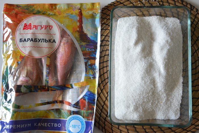 Рыбу обильно посыпать солью, чтобы не было просветов (голову можно оставить без соли). Выпекать в хорошо разогретой духовке при 200°С. Я не стала переворачивать рыбу и выпекала 40 минут.