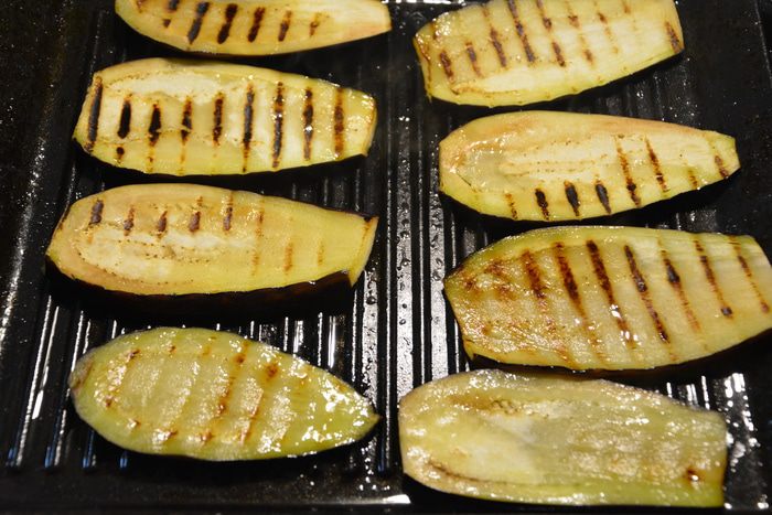 Баклажаны помыть и нарезать длинными полосками. Жарить на сковороде-гриль с двух сторон до мягкости. Посолить.
