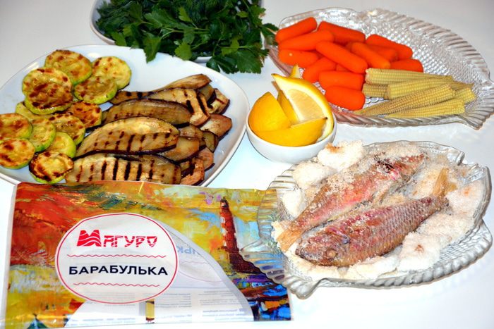 Предлагаю приготовить барабульку ТМ «Магуро» в соляном панцире в духовке. Рыба получается сочной и мягкой. А подавать мы к ней будем овощи на пару и овощи гриль.