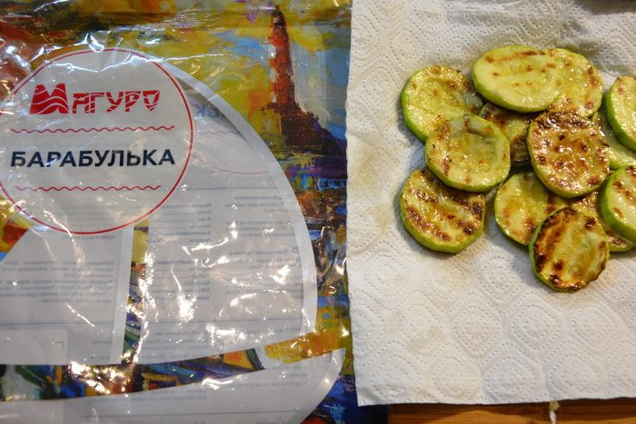 Выложить жареные кабачки на бумажное полотенце, чтобы стекло лишнее масло.