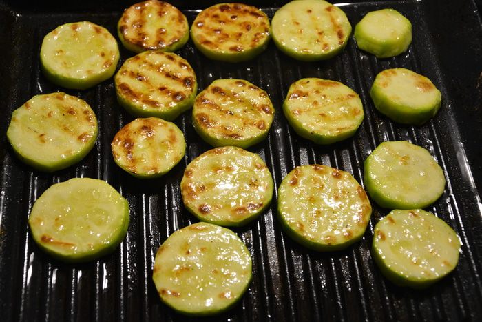 Кабачки помыть, нарезать кружочками. Жарить на сковороде гриль с двух сторон до мягкости. Посолить.