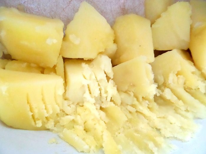 У меня осталось немного отварного картофеля,решила добавить для вкуса и объёма))) Разминаем картофель вилкой.