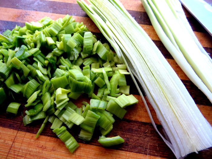 Лук-порей промываем,разрежем вдоль,а потом измельчим.