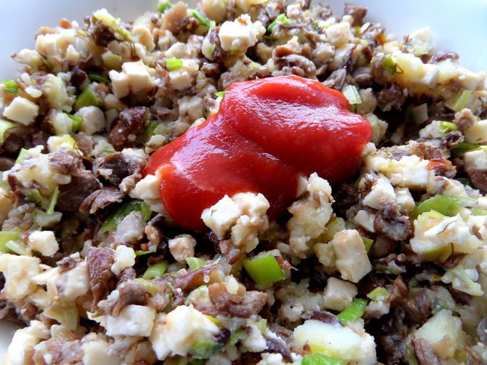 Ещё добавила заправку (пару ложек) от салатика "девчачий" от Марципанки,в нём уксус бальзамический,чеснок,масло,я ещё добавляла засоленный укроп.
