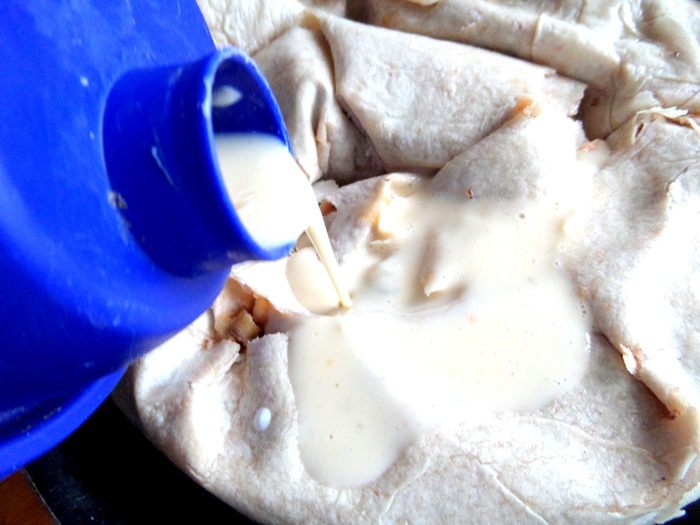 Рулет должен весь "утонуть" в заливке. отправляем запекаться при 180*.