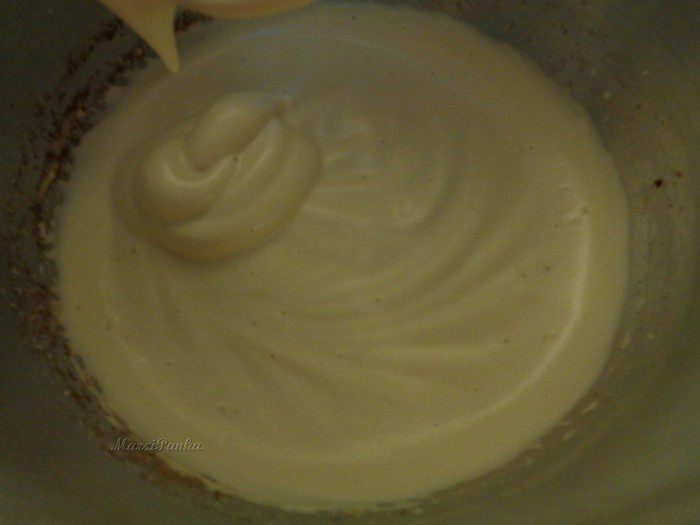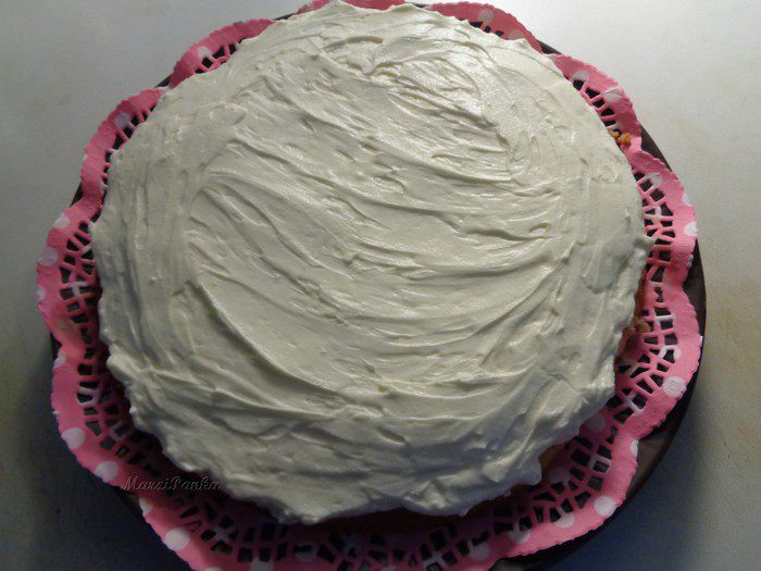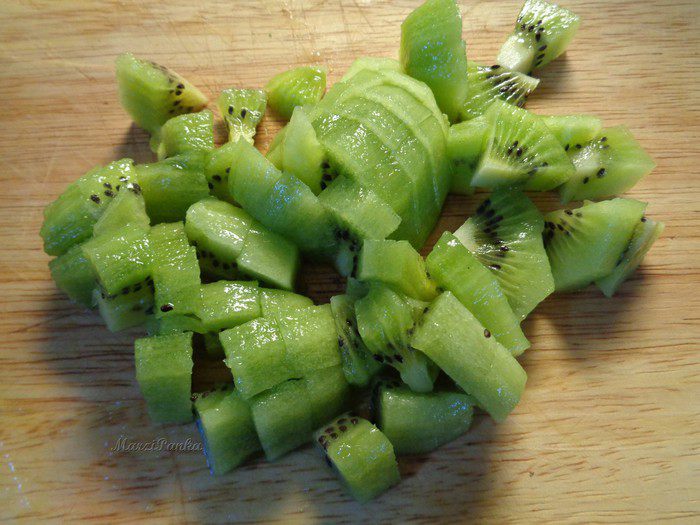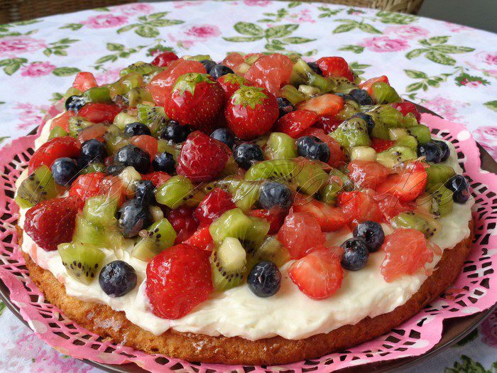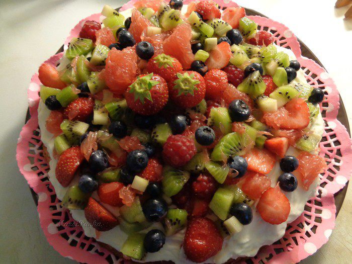 Фрукты и ягоды сверху промазала желирующим сахаром. Для этого в кастрюльке смешала желирующий сахар и воду, довела до кипения, отставила на 1 минуту и опять довела до кипения. Дала немного остыть, время от времени помешивая, и покрыла ягоды и фрукты для блеска и сохранности.