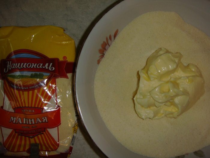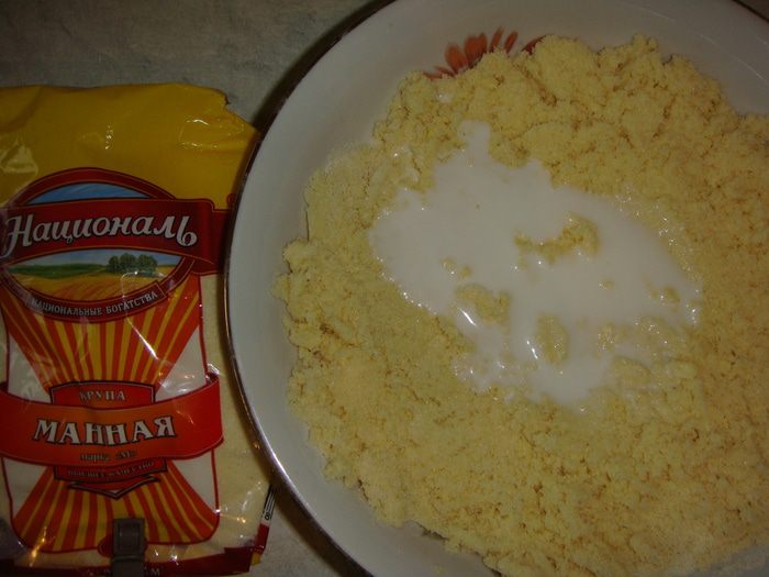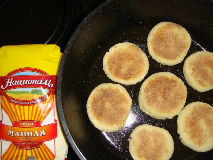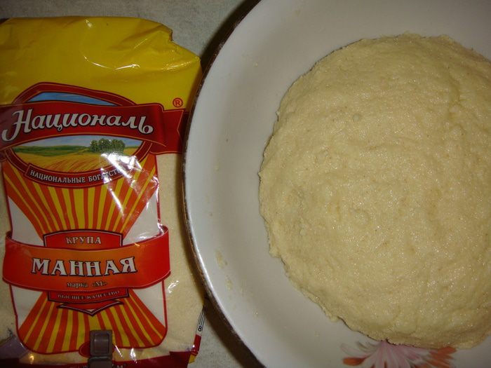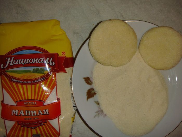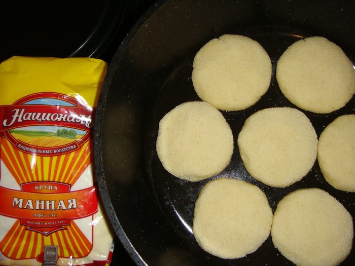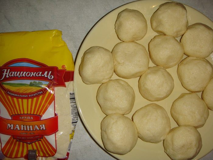 Каждый шарик немного расплющить и обмакнуть в манку с двух сторон.