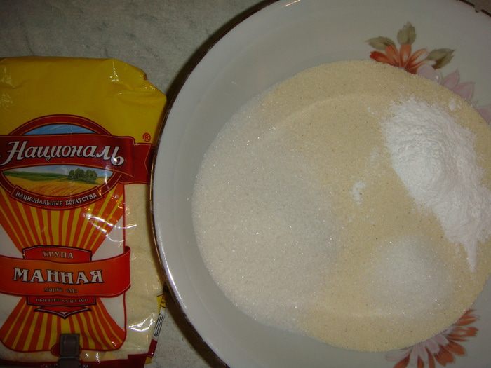 В миску всыпаем манную крупу ТМ «Националь», соль, сахар, ванильный сахар и разрыхлитель. Все хорошо перемешиваем.