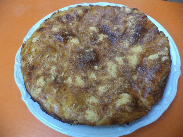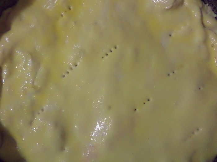 Начинку полить заливкой. Накрыть оставшимся пластом теста и плотно защипить края.