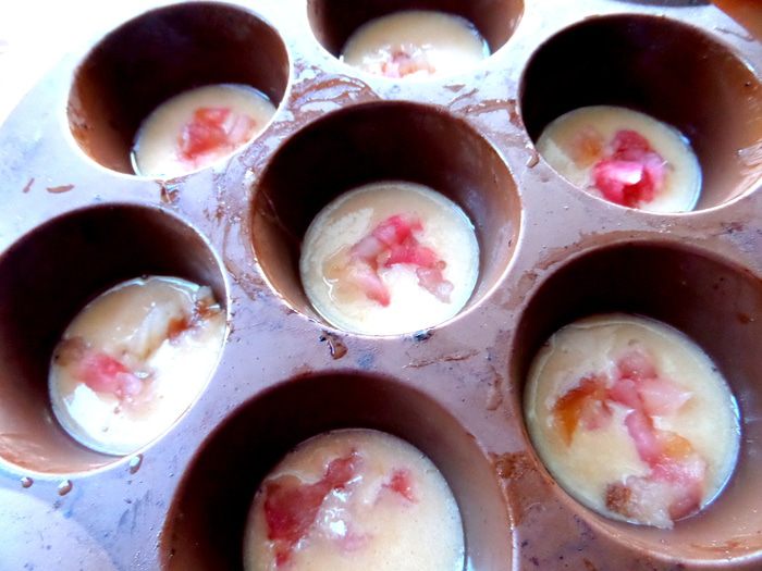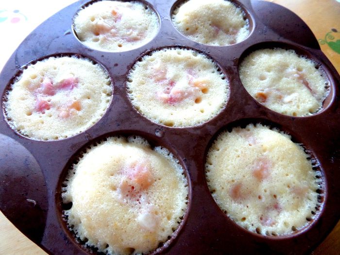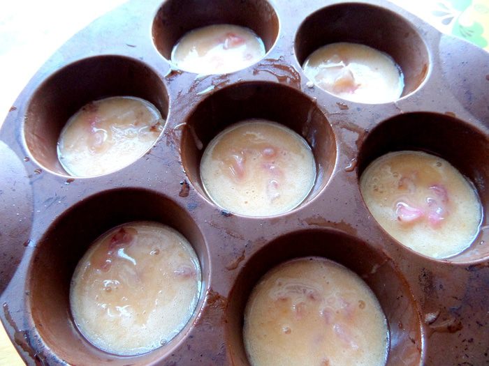 Берём силиконовую форму и наливаем половину теста, сверху в каждую ячейку положим начинку.