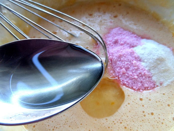 Вливаем растительное масло. Вместо крахмала я взяла сухой кисель ароматный клюквенный. Добавим разрыхлитель. Перемешиваем.
