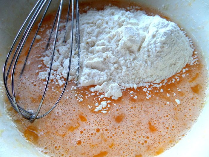 Высыпаем муку. У Вали муки 2 ложки с горкой, я их отмерила и получилось 50 г. Снова чуть взбить.