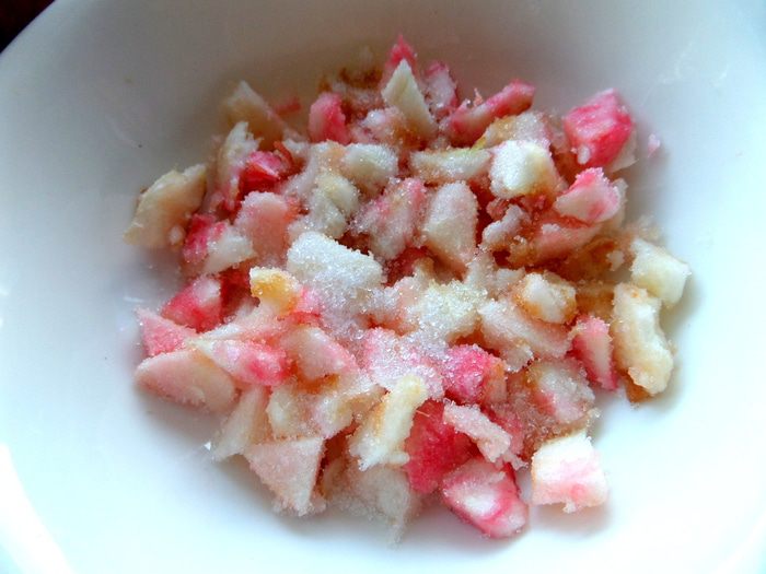 Запекание яблок я упростила...Просто нарезала на кусочки, присыпала сахаром и поставила в СВЧ на минуту.