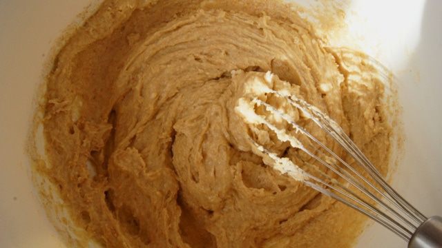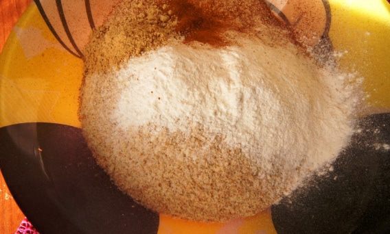 Сухие продукты смешать (оба вида муки, разрыхлитель, специи).
