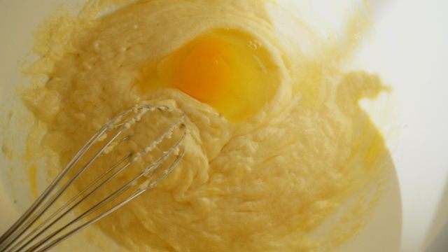 Для теста взбить размягченное сливочное масло и сахар до пышности, добавить по одному яйца.