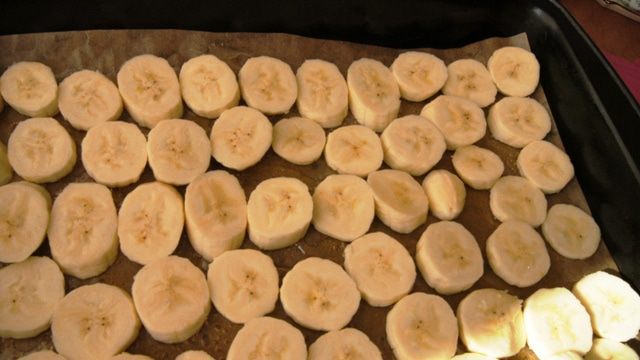 Бананы нарезать кружками и распределить по карамели в один слой.