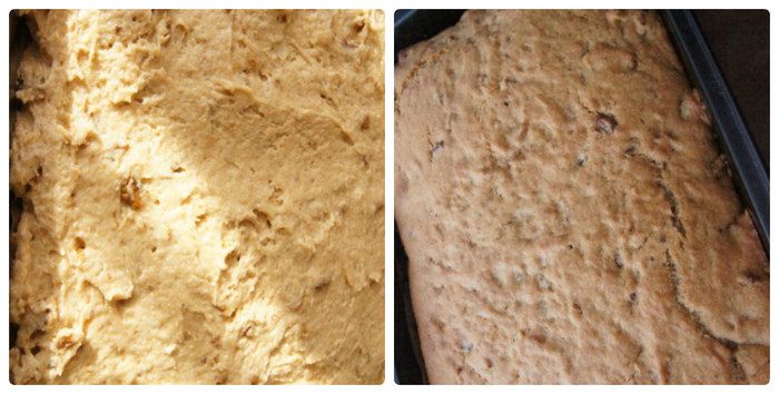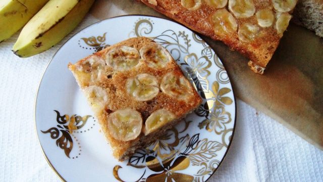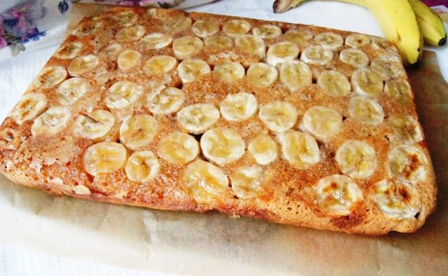 Тесто распределить поверх бананов, разровнять лопаткой. Духовку предварительно разогреть до 190°С. Выпекать пирог 25-30 минут до сухой палочки.