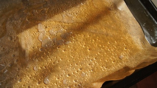 Нам понадобится форма для выпечки, выстеленная пергаментом. Сварить карамель из воды и сахара в толстостенной кастрюле до легкого коричневого цвета и сразу вылить ее на пергамент, осторожно распределяя по нему. Можно приготовить карамель из сливочного масла и сахара.