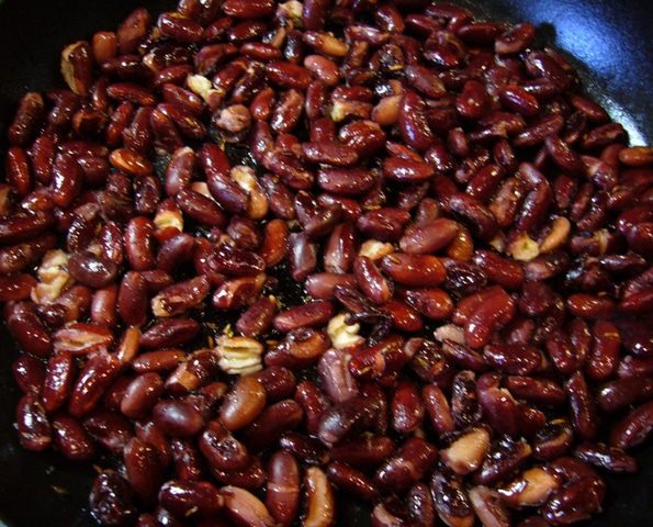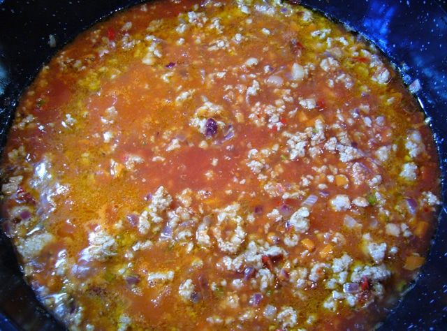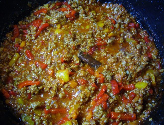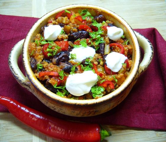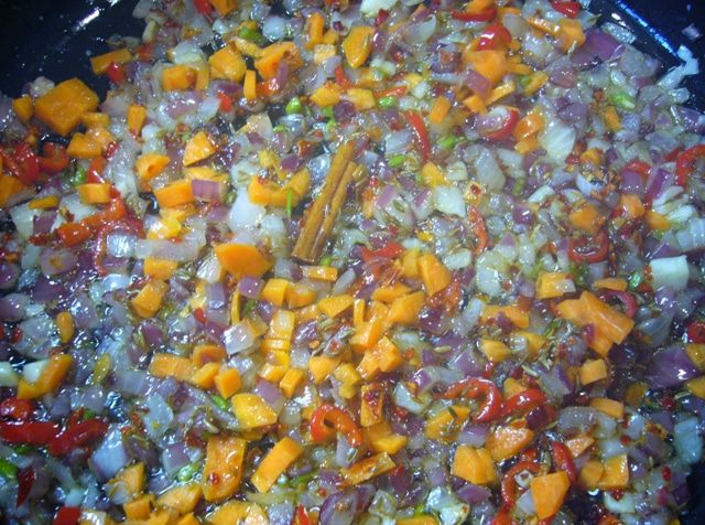 В сотейнике с разогретым оливковым маслом обжарить лук, чеснок, рубленые веточки кинзы, бОльшую часть перца чили (оставить немного для подачи) – 10 мин.