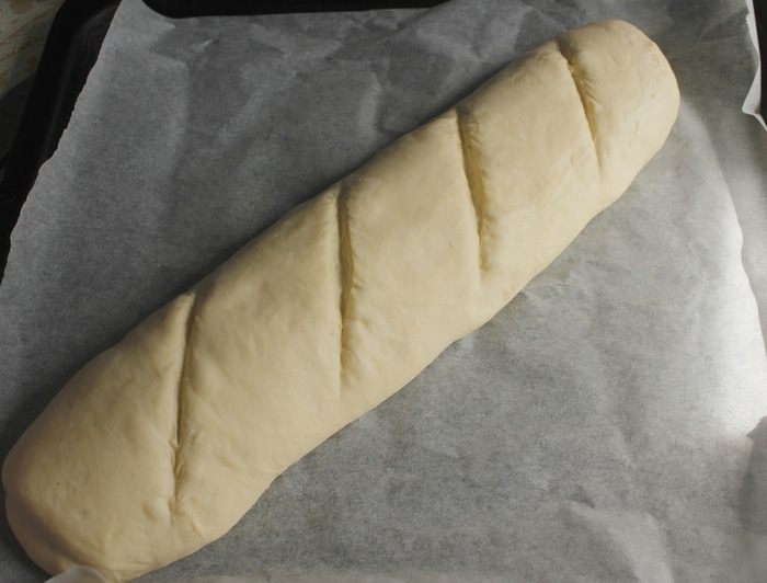 И уложить швом вниз. Накрыть полотенцем и оставить на 45 мин. для расстойки под пленкой. Перед выпечкой сделать по 3 косых надреза.