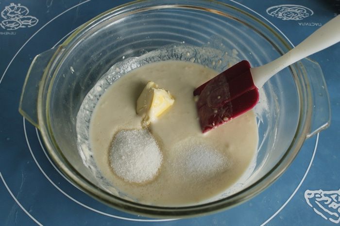 Туда же добавить размягченное масло, муку, соль, сахар.