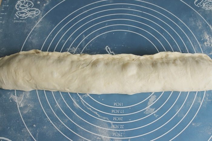 Раскатать шар в прямоугольник, скрутить в длинный рулет, защипнуть края .
