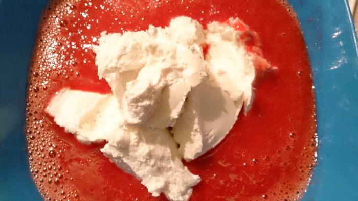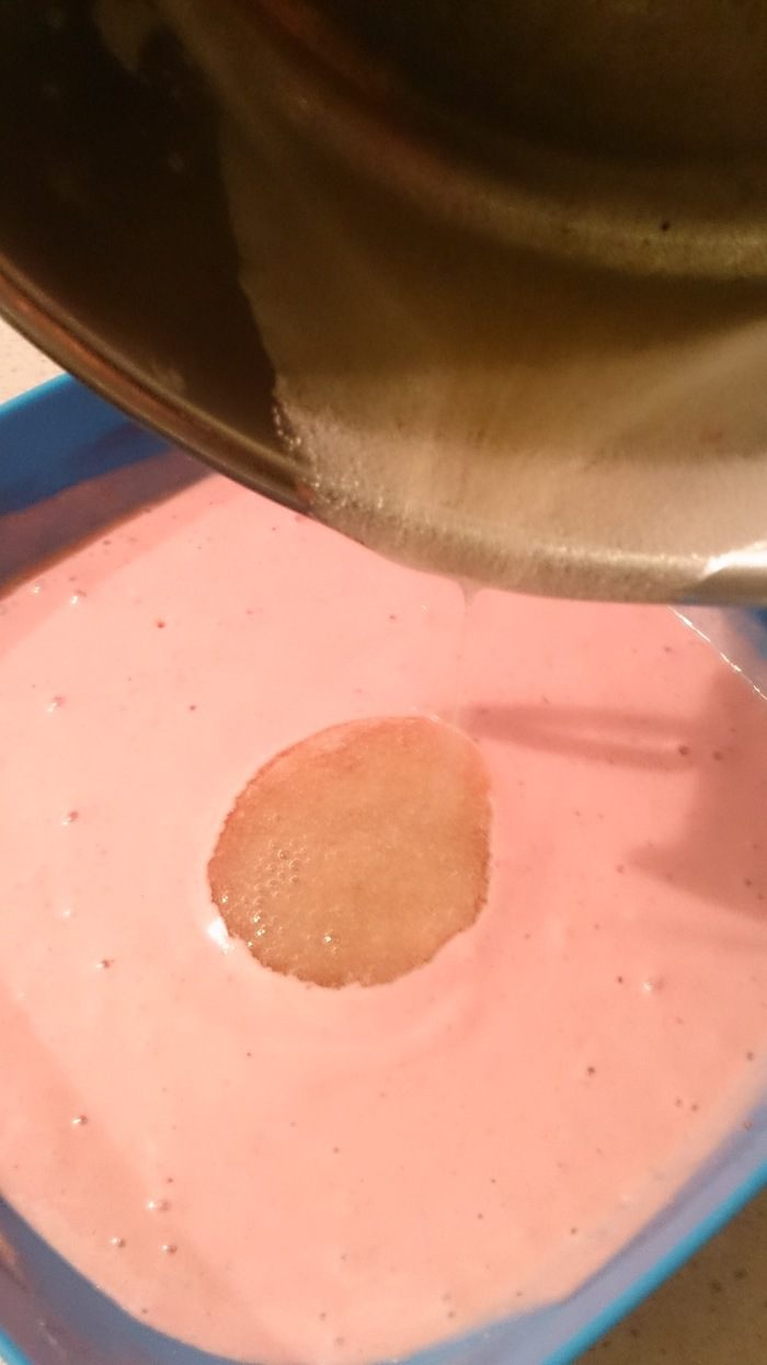 Теплый распущенный желатин введите в клубничный мусс и перемешайте.