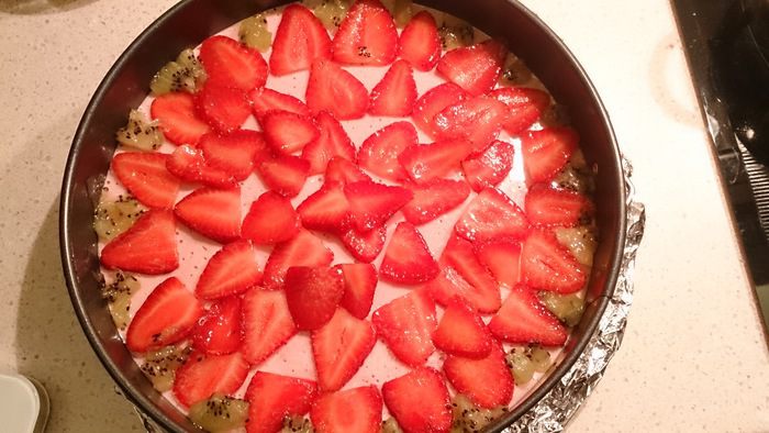 Положите испеченный бисквит в разъемную форму d 24 см. Сверху залейте клубничным муссом и поставьте на 30 мин. - 1 час. в холодильник для застывания.