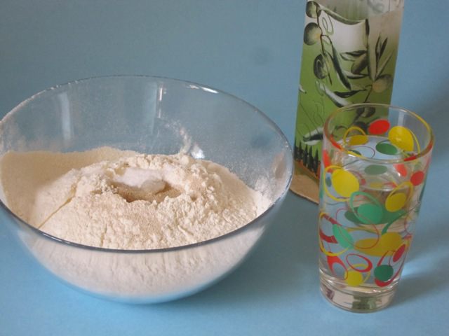 Для питы просеять муку, добавить сухие дрожжи, соль, 1 столовую ложки оливкового масла.