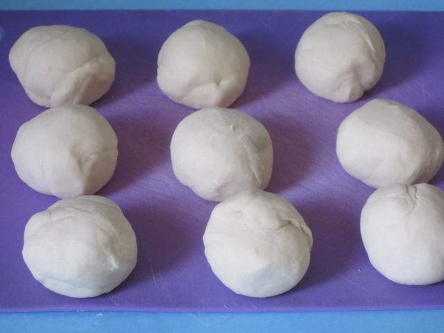 Разделить тесто на 9 частей. Скатать их в шарики. Уложить на посыпанную мукой доску. Накрыть полотенцем и оставить на 40 минут.