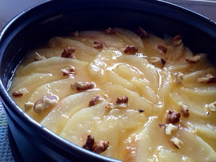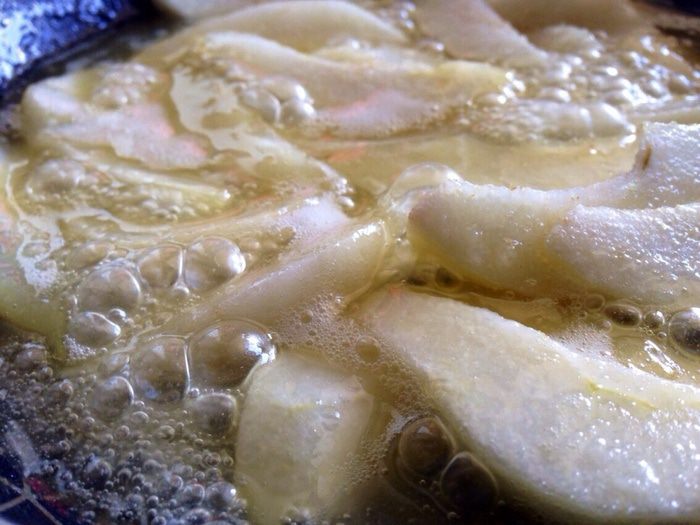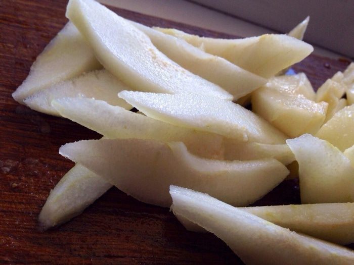 В сковороде растопить сахар, воду, сок лимона и сливочное масло. Как только сахар растворится, добавить груши и перемешать, слегка потряхивая сковороду.Дождаться светло-золотистого цвета карамели, а затем сразу же снять с огня. Отставить сковороду в сторону остывать.