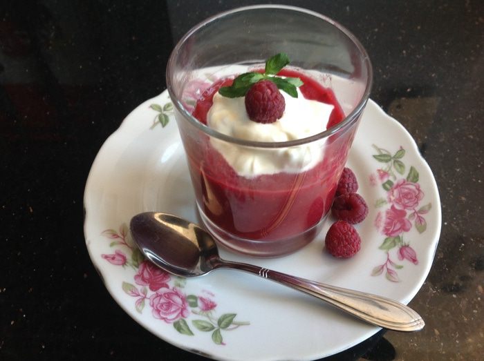 При подаче украсьте свежими ягодами малины, взбитыми сливками и листиком мяты.