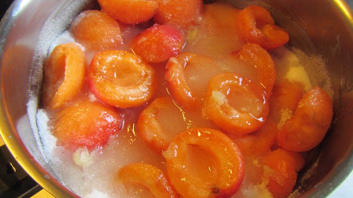 2. В данном рецепте фрукты замачиваются на ночь с сахаром и лимонным соком. Как пишет Делия, это делается для того, чтобы потом в процессе приготовления половинки фруктов лучше держали форму. Если за ночь сока выделилось ну очень много, то лучше часть его слить (оставить столько, чтобы он покрывал фрукты).