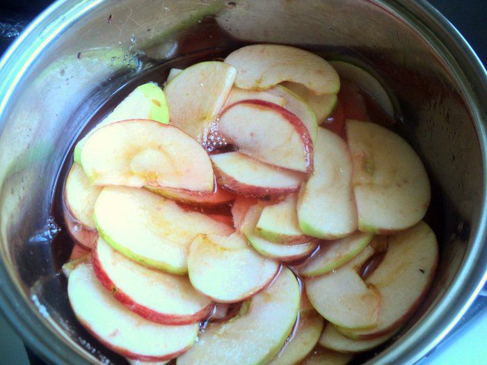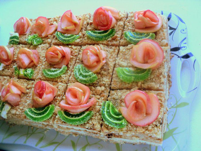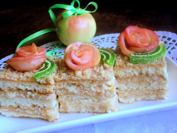 От себя я еще украсила пляцок розочками из яблок. Для украшения яблоки разрезать на четвертинки, удалить семена и нарезать тонкими пластинками. Проварить пластинки яблок в сахарном сиропе 1-2 минуты до мягкости (но не переварить). Затем пластинки вынуть из сиропа и свернуть из них розочки. В сироп можно по желанию добавить капельку красного пищевого красителя, тогда розочки будут нежного розового цвета.
