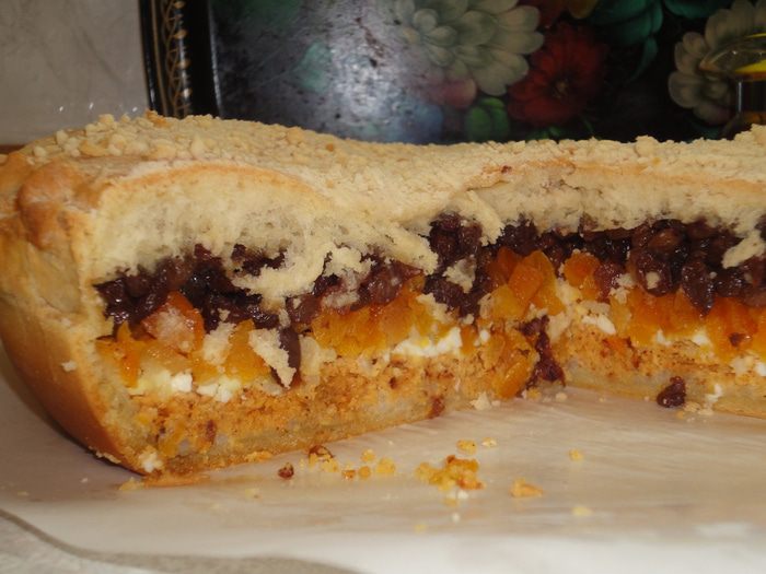 Сверху закрыть вторым пластом теста, смазать растопленным сливочным маслом и посыпать крошкой из сливочного масло и муки.