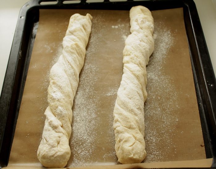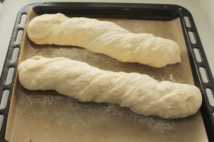 Выкладываем тесто на стол, делим пополам. Каждый кусок теста 2 раза прокручиваем через себя и выкладываем на противень с пекарской бумагой. Посыпаем мукой.