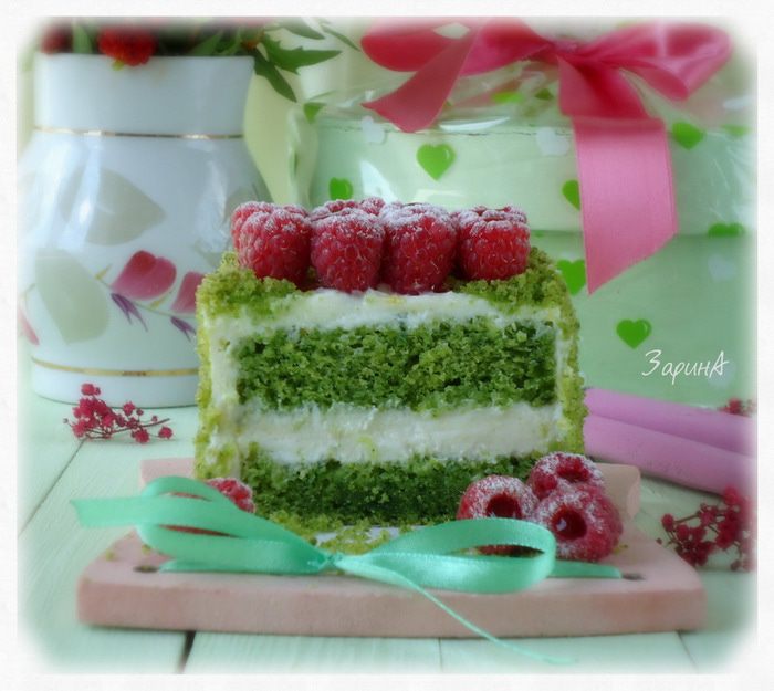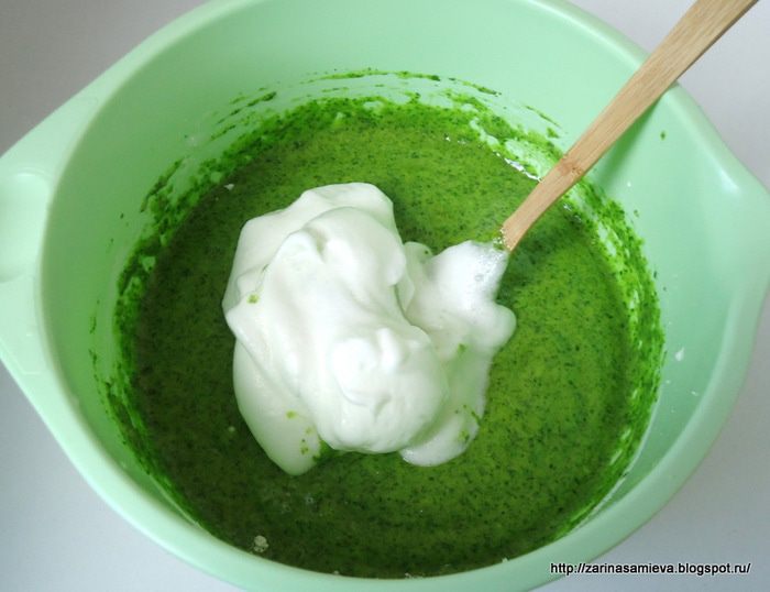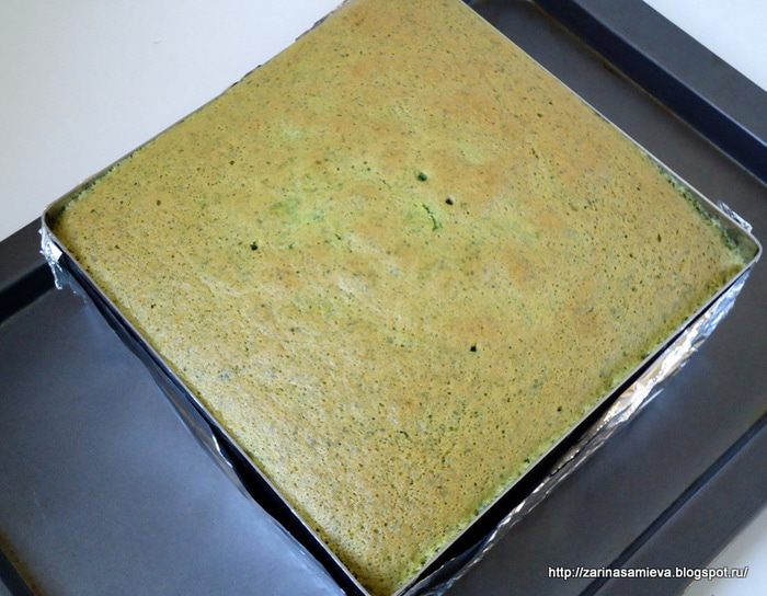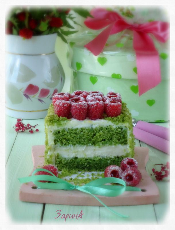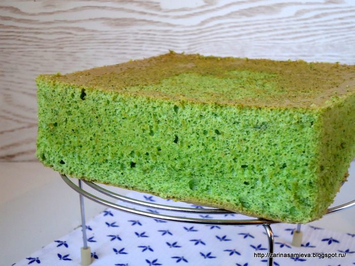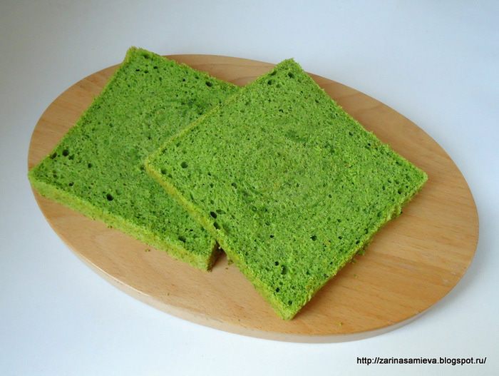 Шпинатный бисквит я пекла не один раз. По структуре он шифоновый, нежный и сочный. Именно этот бисквит я подкорректировала под свой вкус. Шпинат, вкуса не дает, у него иная миссия – насытить бисквит красками и дать ему чудную пористую структуру. Крем здесь сметанный, который я придумала (конечно, это громко сказано) для своего любимого морковного пирога «Оззи» http://www.edimdoma.ru/retsepty/57559-lyubimyy-morkovnyy-pirog-ozzi