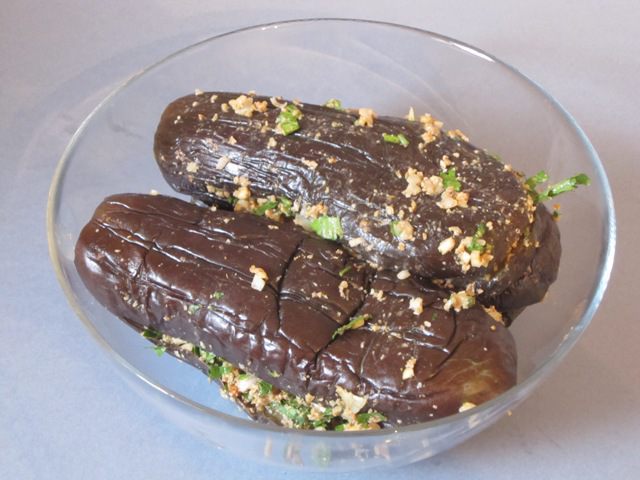 Соединить уксус с водой ( в пропорции 1:3), добавить соль по вкусу, вторую часть начинки. Можно уксуса взять поменьше. Перемешать. Залить соусом баклажаны.